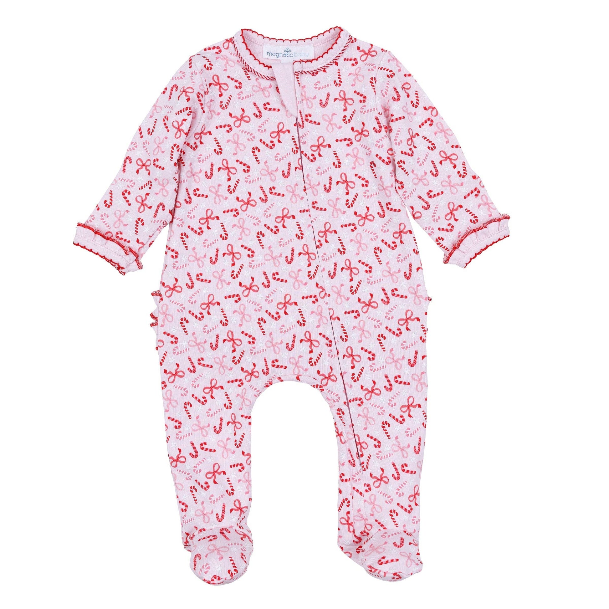 Make holiday snuggles even sweeter with our Candy Cane Lane Ruffle Footie. This precious footie is made from luxurious, ultra-soft Pima cotton and features a charming all-over print of candy canes and bows. Ruffle trim and a smooth two-way zipper add the perfect blend of style and convenience—ideal for sleepy newborn cuddles and busy diaper changes.