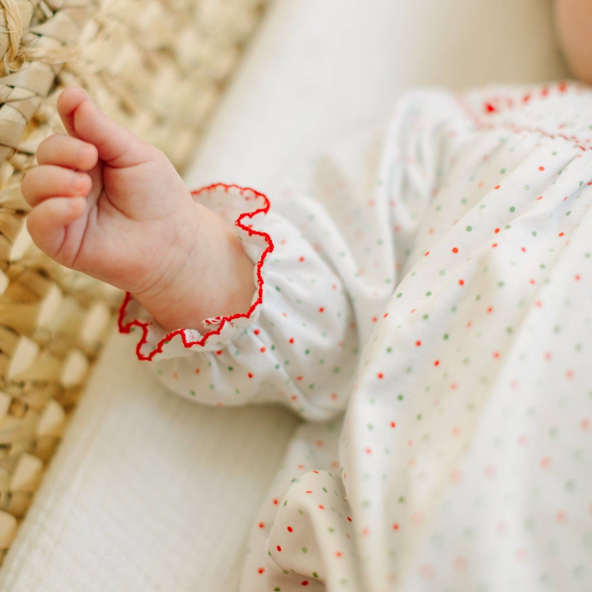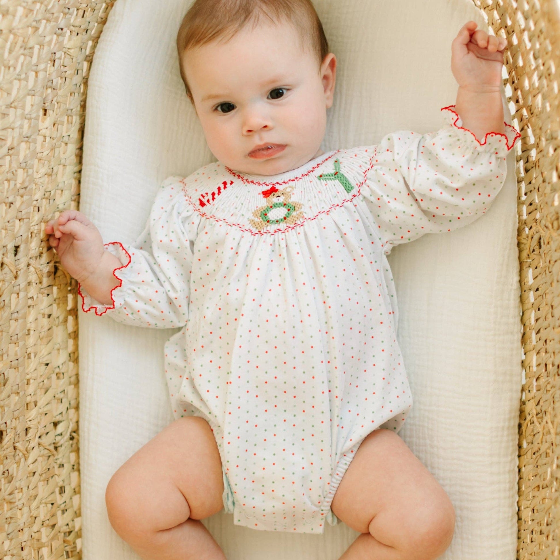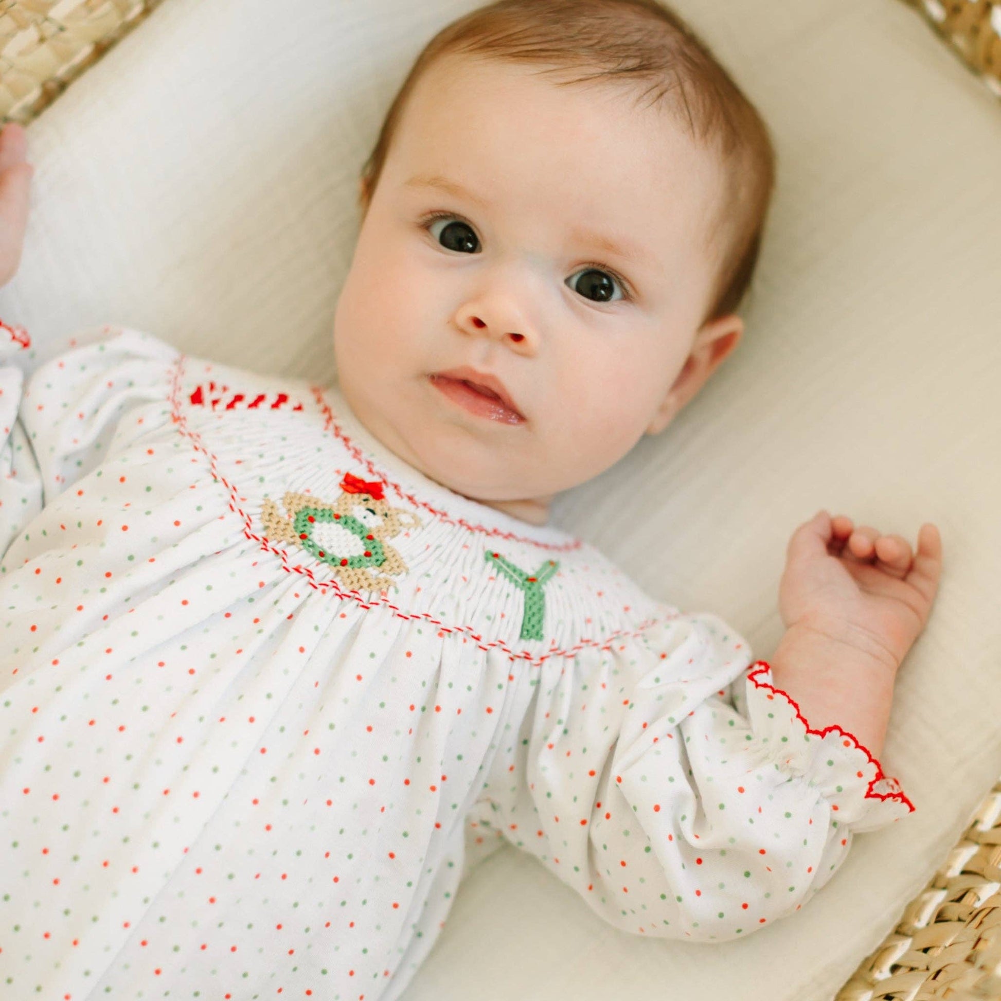 Celebrate the season in classic Christmas sweetness with our Christmas Joy Bishop Bubble. Made from ultra-soft Pima cotton, this darling bubble features hand-embroidered smocking with a candy cane, teddy bear wreath, and Christmas tree spelling out JOY. Bishop sleeves and red picot trim add the perfect feminine, festive touch.