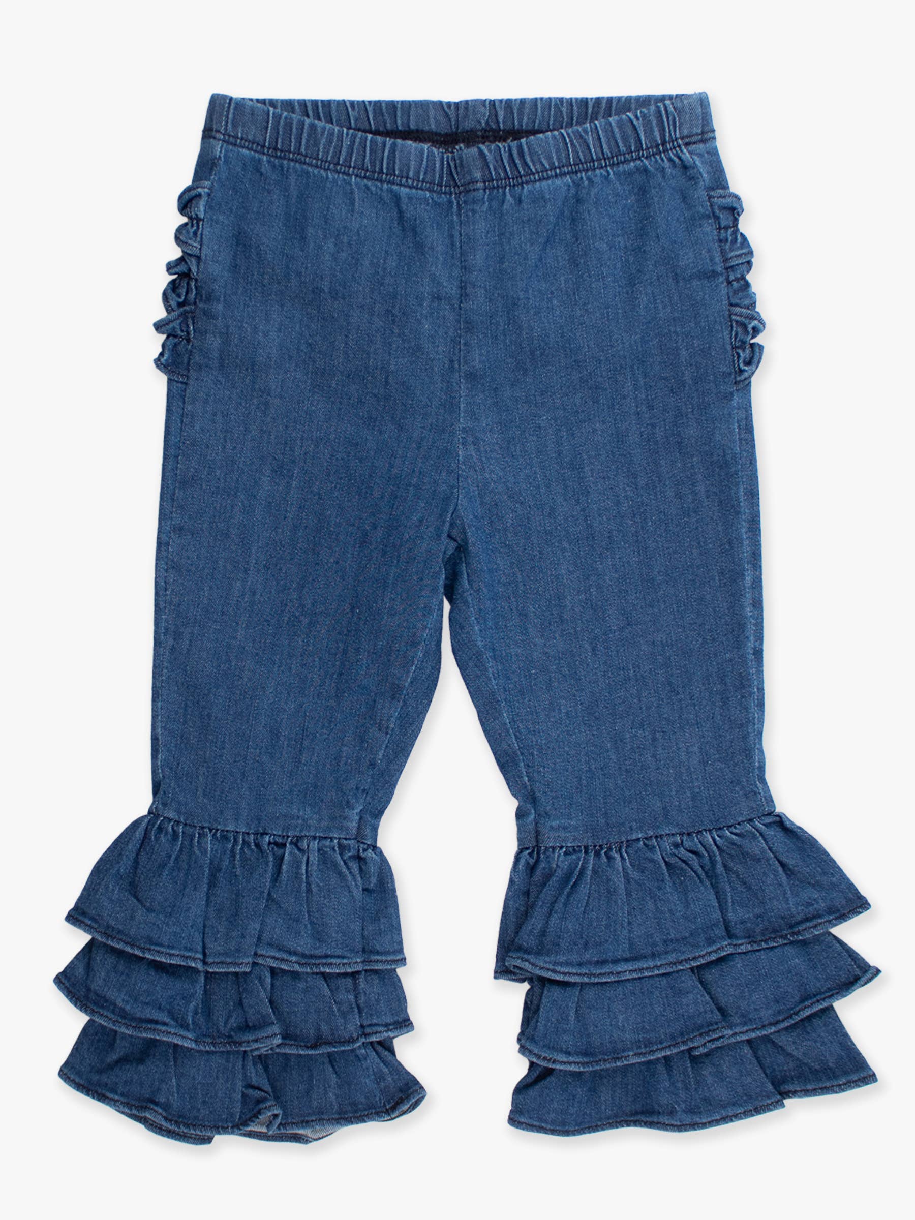 Bring playful style to her denim days with our Girls Ruffle Flare Jeans. Made from soft, stretchy denim, these jeans feature layered ruffle flares at the hem and sweet ruffle detailing on the back for an extra touch of charm. The pull-on waistband makes dressing easy and comfy for all-day wear. Perfect for pairing with her favorite tops, these jeans add a fun and girly twist to any outfit!