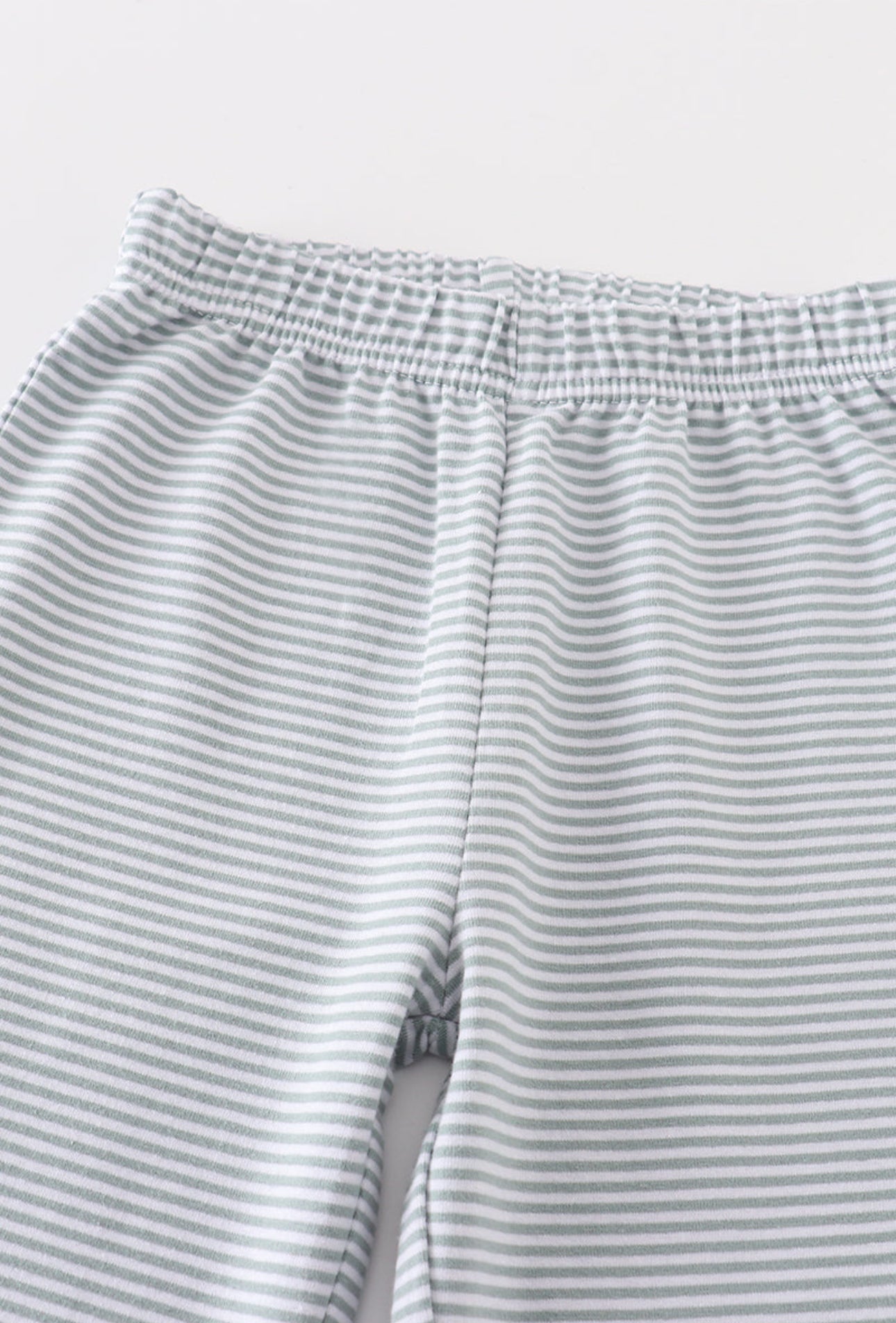 This adorable two-piece outfit features a soft sage-green top with a charming turkey applique and coordinating striped pants. Crafted from a lightweight cotton blend that’s gentle on delicate skin, it’s perfect for all-day play, family gatherings, and those sweet Thanksgiving photos.