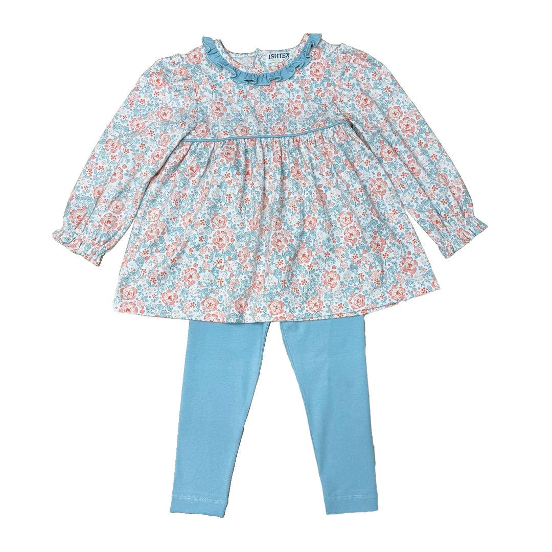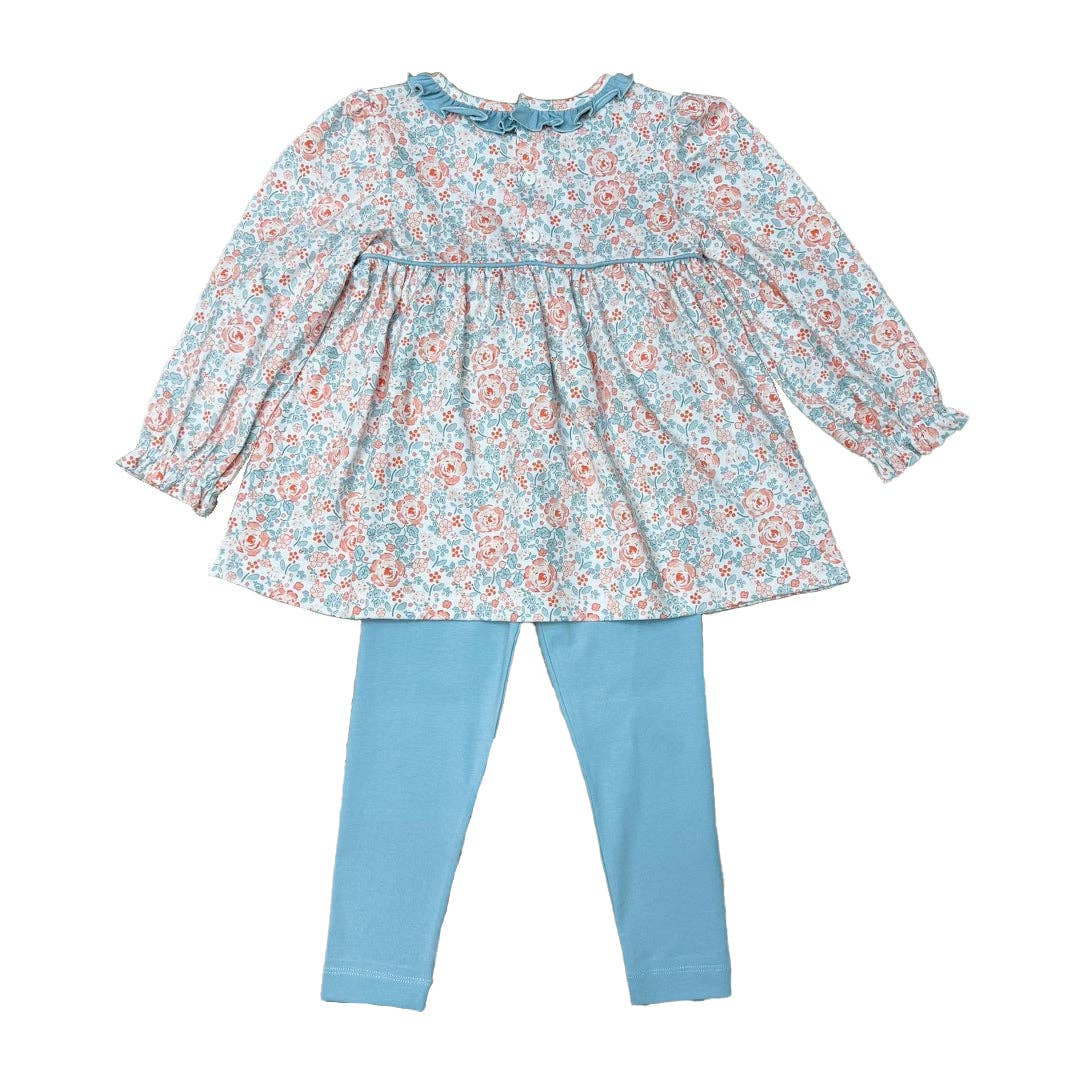 The Millie Legging Set is a darling everyday outfit with the prettiest vintage floral touch. The long-sleeve tunic features a soft blue background sprinkled with rose-colored blooms, finished with a ruffled blue collar and gentle gathers that create a sweet, flowing silhouette. Coordinating blue leggings made from soft, stretchy knit keep her comfortable from morning playtime to afternoon errands.