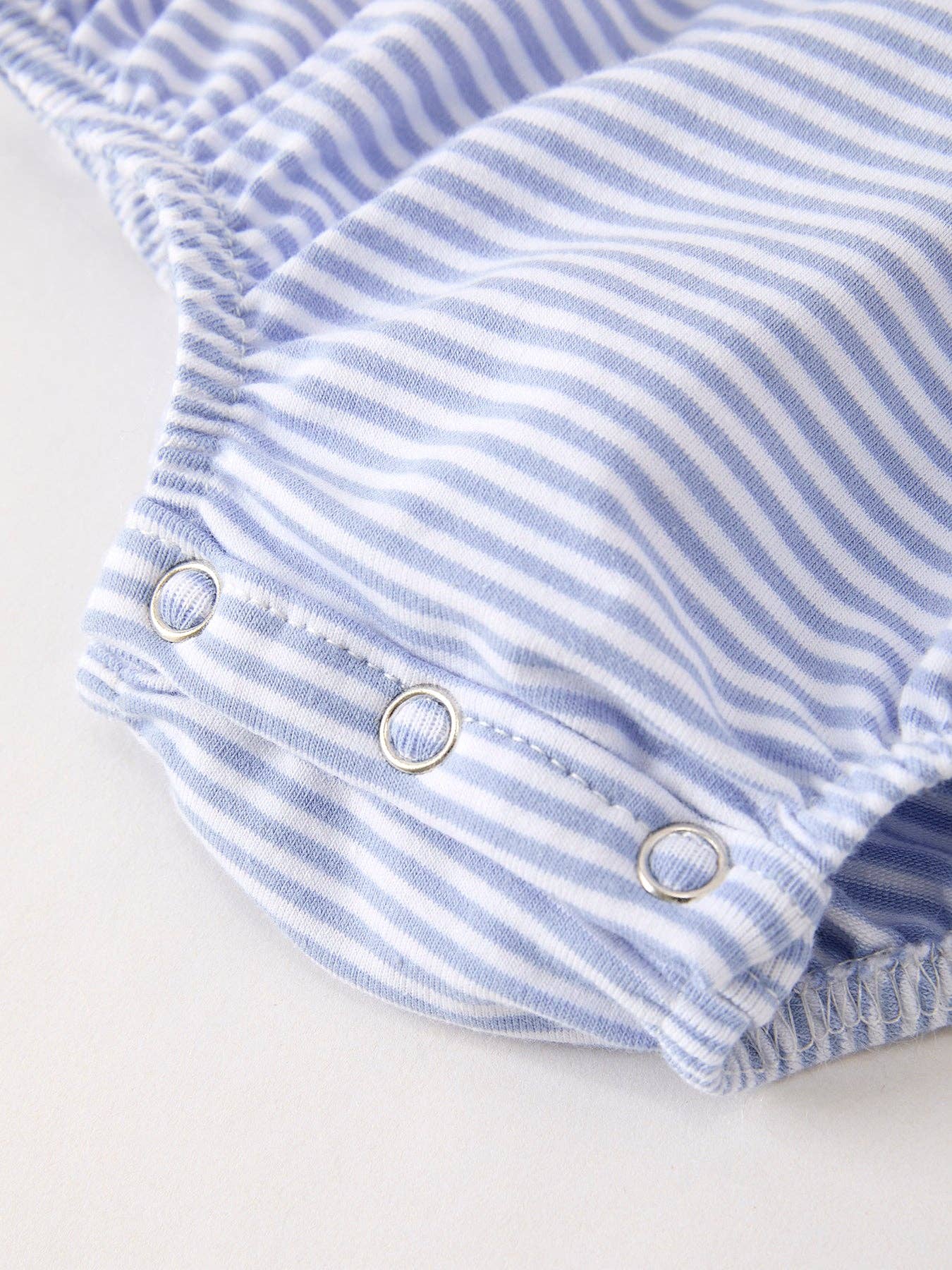 Add a pop of pumpkin charm to your little one’s fall wardrobe with our Pumpkin Bow Bubble. Featuring classic blue and white stripes, a sweet peter pan collar, and bold orange bows at the sides, this bubble is all about festive flair. The pumpkin applique at the chest makes it perfect for patch visits, family photos, and all your autumn outings. Easy snaps at the bottom make dressing simple and quick.