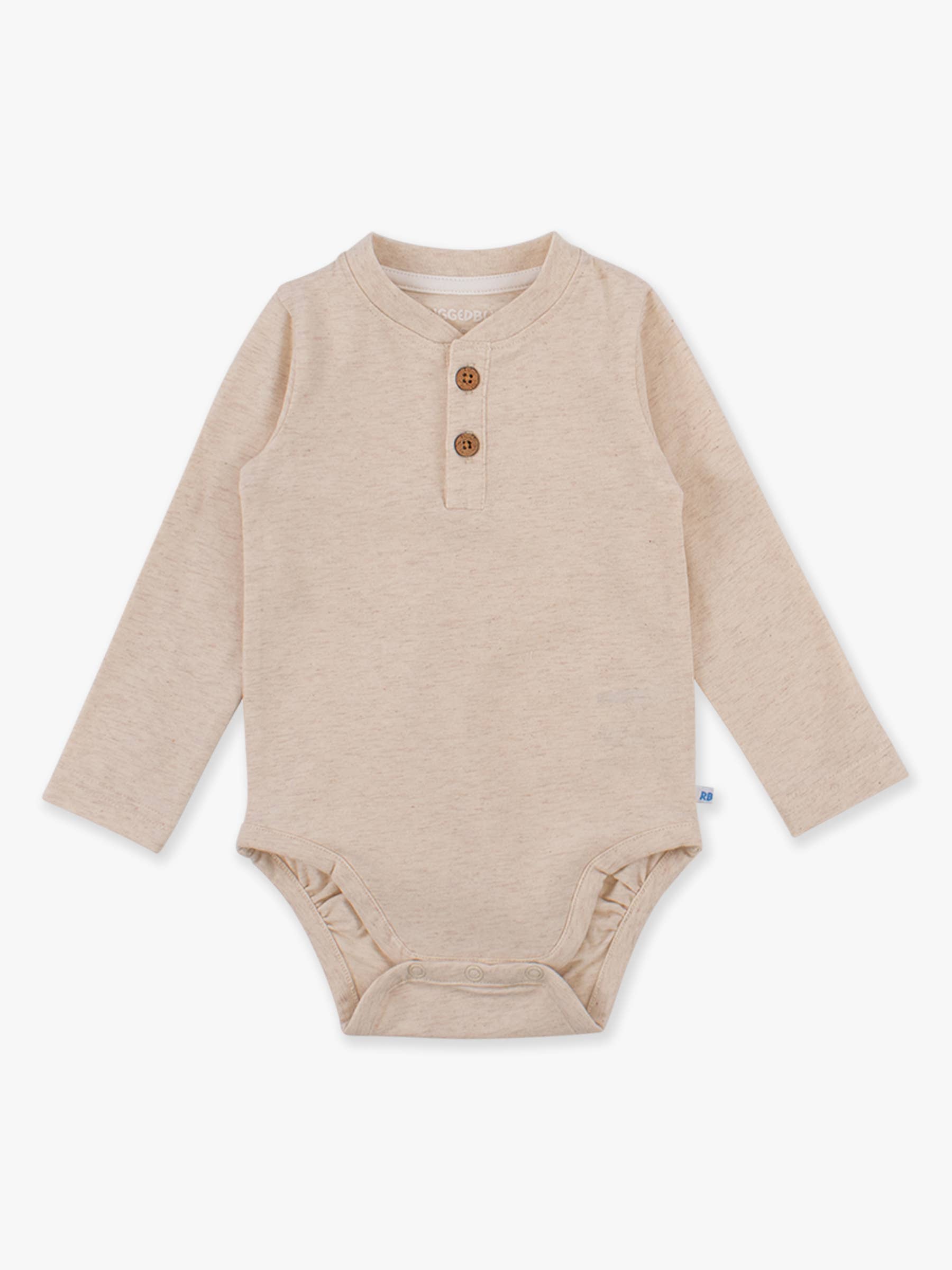 A timeless essential for your little guy’s wardrobe, The Charlie Henley Bodysuit is soft, neutral, and made for everyday wear. The cozy knit fabric, classic 2-button henley neckline, and gentle oatmeal hue make it perfect on its own or layered under overalls, rompers, and sweaters. Snaps at the bottom make changing quick and easy — because real life matters, too.