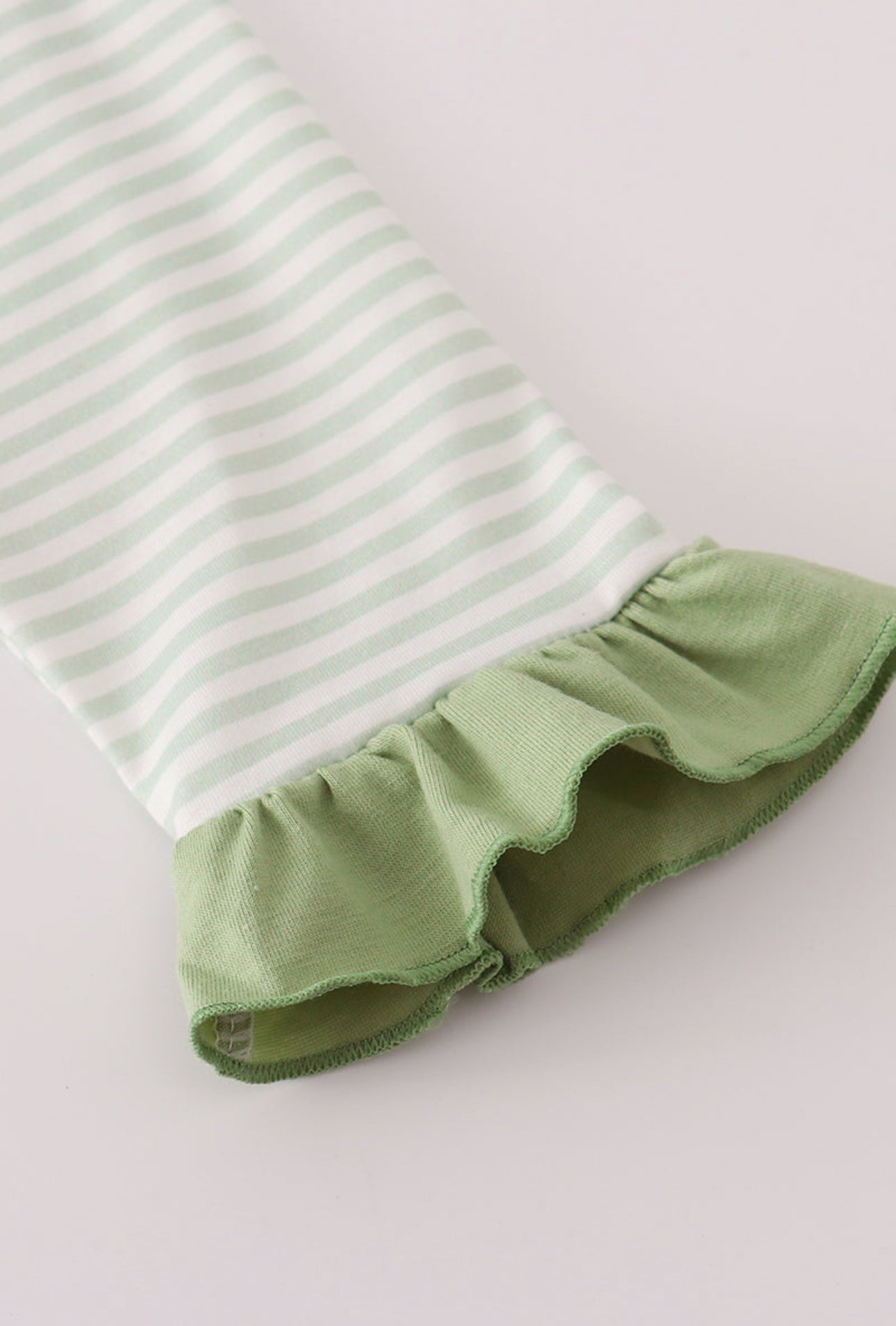 This comfy two-piece set features a soft green-striped top with a playful turkey applique and sweet ruffle sleeves, paired with coordinating solid green pants. Made from lightweight, breathable fabric with just the right amount of stretch, it’s perfect for family gatherings, classroom parties, and cozy playdays.