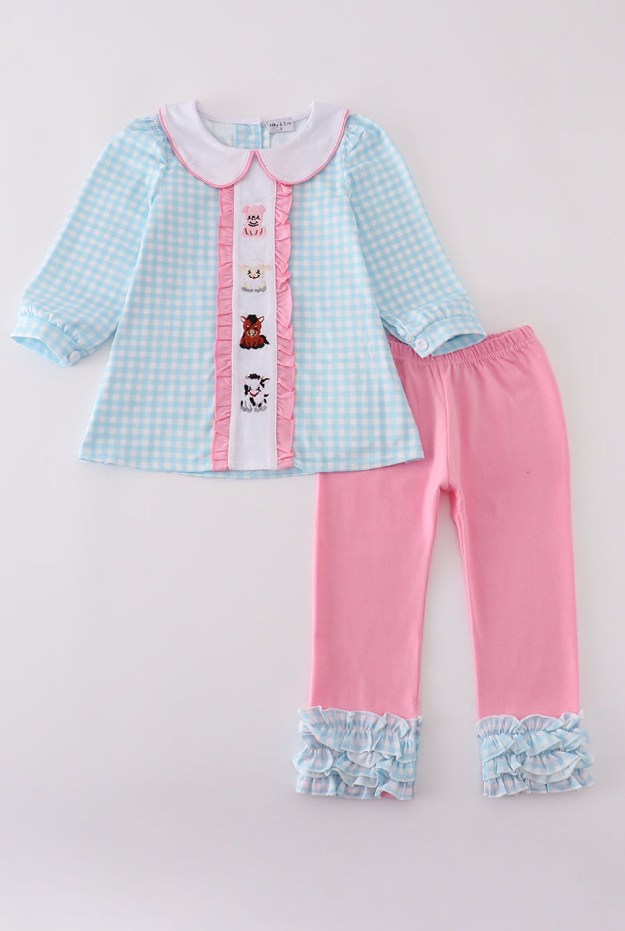 - Playful gingham meets sweet barnyard charm. The Barnyard Buddies Set features a light blue gingham top with a Peter Pan collar, ruffle trim, and embroidered farm animals. Paired with pink ruffle pants, this set is as comfy as it is adorable — perfect for everyday play and picture-ready moments.
